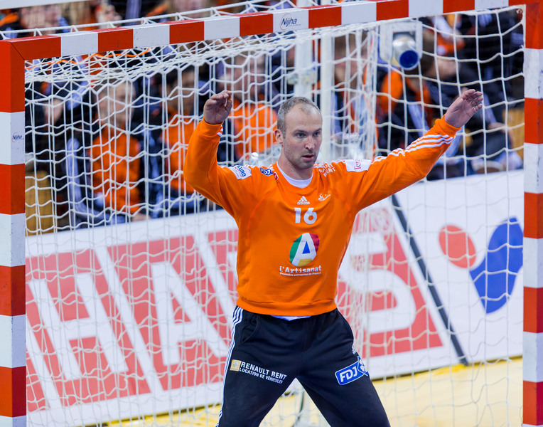 | Thierry Omeyer gegen Hans Lindberg. | Spielszene. | Vor dem Spiel. | Thierry Omeyer. | |||