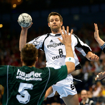 | Frode Hagen überspringt die Göppinger Abwehr mit Dragos Oprea. | ||||||