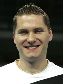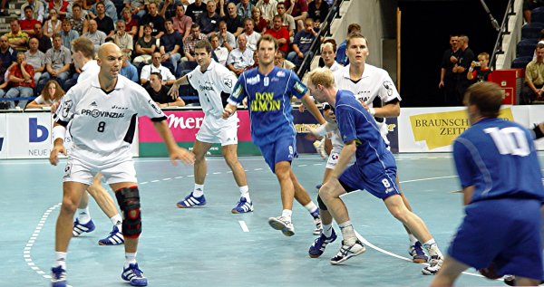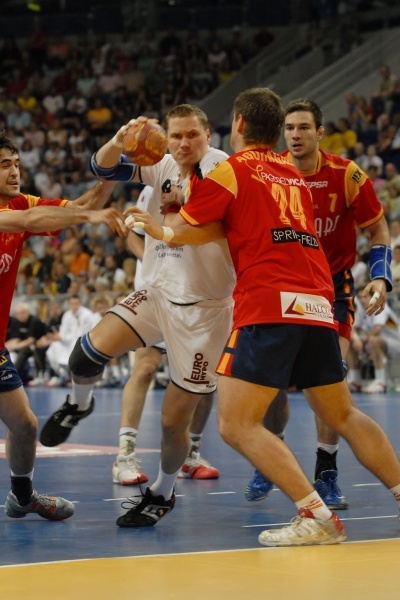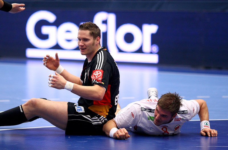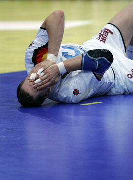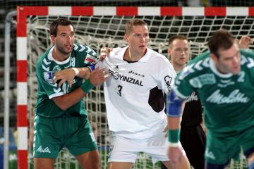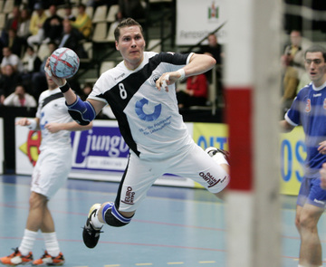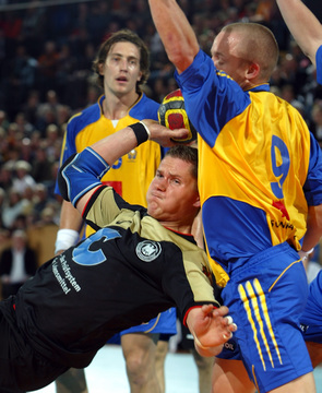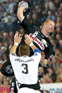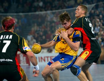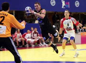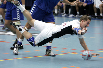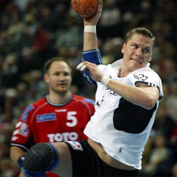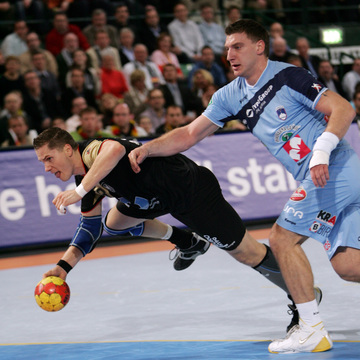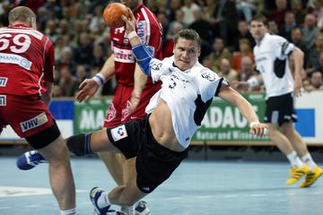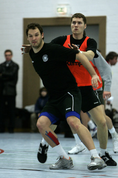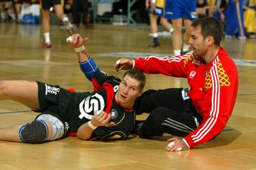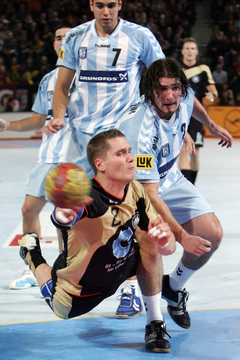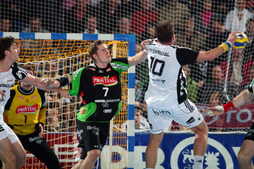 | World Cup 2006, GER - SRB: Sebastian Preiß. | EM 2006: GER - RUS: Sebastian Preiß. | EM 2006: GER - ESP: Sebastian Preiß. | Packender Pokal-Fight: Kiels Nikola Karabatic und Lemgos Sebastian Preiß streiten am Boden um den Ball. Im Hintergrund Daniel Stephan. | |||