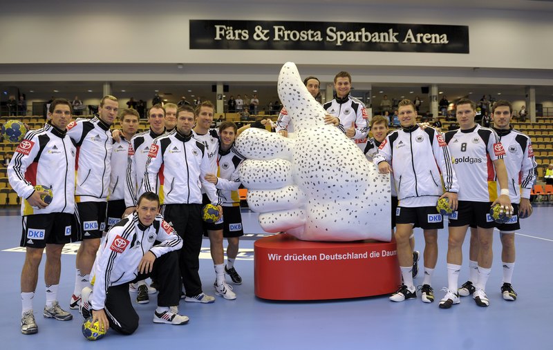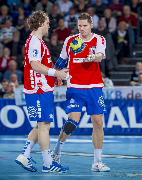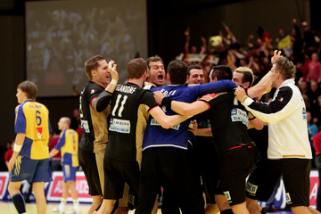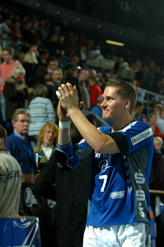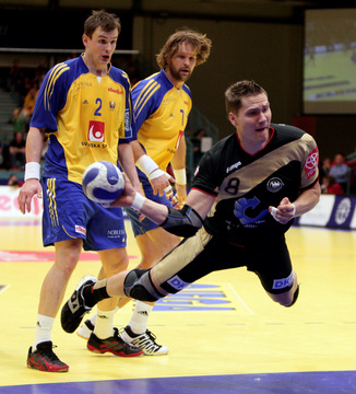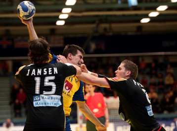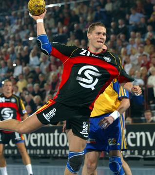 | Sebastian Preiß. | Auch die deutschen Spieler mussten singen. | Sebastian Preiß traf gegen Sävehof fünf Mal. | "Harry" im Kampf um den Ball. | |||