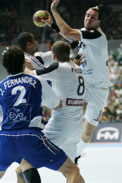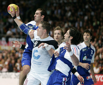 | WM 2007: GER-FRA: Sebastian Preiß. | WM 2007: GER-FRA: Karabatic gegen Kraus. | WM 2007: GER-FRA: "Pommes" zieht ab. | WM 2007: GER-SLO: Sebastian Preiß. | |||