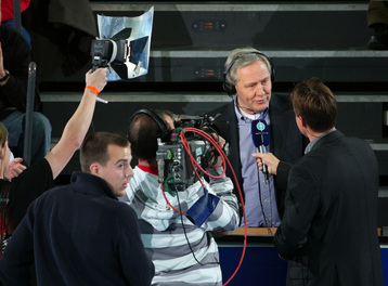 | Noka und Mirjana Serdarusic. | Zvonimir Serdarusic im TV-Interview. | Noka und Mirjana Serdarusic auf der Tribüne. | Vor dem Spiel - Im Hintergrund: Interview mit Zvonimir Serdarusic. | |||