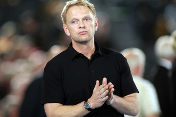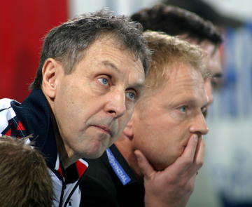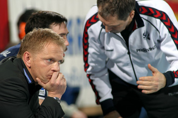 | Flensburgs Trainer Kent-Harry Andersson und SG-Geschäftsführer Thorsten Storm sitzen nebeneinander auf der Bank. | SG-Geschäftsführer Thorsten Storm sitzt mit nachdenklicher Miene auf der Bank, während im Hintergrund Flensburgs Trainer Kent-Harry Andersson mit Andrej Klimovets spricht. | Thorsten Storm. | Thorsten Storm. | |||