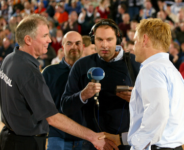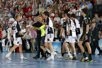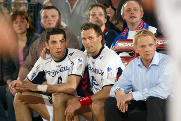 | Tumulte nach Christian Zeitz' Kopftreffer bei Jan Holpert. | Blazenko Lackovic, Christiansen und Storm. | SG-Manager Thorsten Storm. | Uwe Schwenker (links) gratuliert Thorsten Storm. | |||