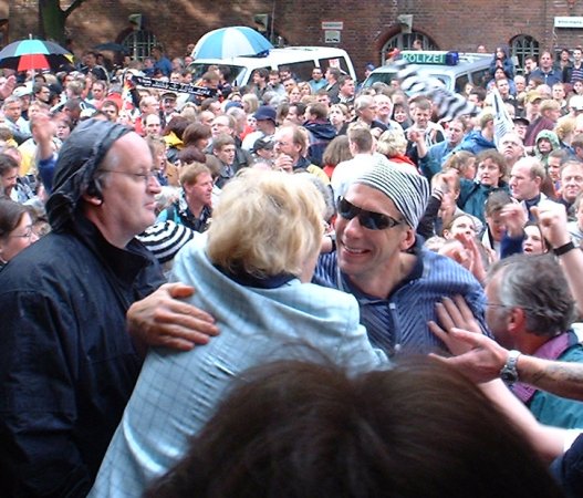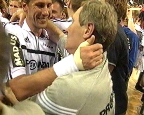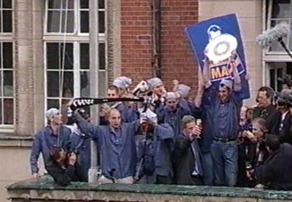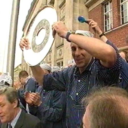 | Abschied von Max: Max im schwarz-weißen Ballon-Meer. | THW wird in Flensburg Meister: Abschied mit Tränen. | THW wird in Flensburg Meister: Max im Interview. | Meisterfeier 2002: Jubel um die Mannschaft. | |||