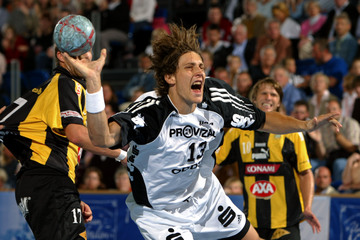 | Marcus Ahlm setzt sich im Angriff gegen den Melsunger Markus Pregler durch. | Marcus Ahlm. | Marcus Ahlm versucht, sich gegen Lars-Henrik Walther und Andrius Stelmokas (links) durchzusetzen. | THW-Neuzugang Nikola Karabatic setzt sich gegen Hammarbys Nicklas Grundsten durch und sucht das Anspiel auf Kreisläufer Marcus Ahlm. | |||