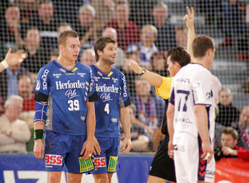 | Flensburg - Lemgo: Filip Jicha. | Stefan Lövgren vs. Filip Jicha. | Filip Jicha, at the background Kavticnik and Ahlm. | Flensburg - Lemgo: Filip Jicha gets 2 minutes. | |||