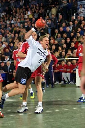 | Staffan Olsson - mit dickem Pflaster. | Teamwork: Petersen blockt, Olsson trifft. | Staffan Olsson. | Zeigte gegen seinen ehemaligen Verein eine tolle Partie: Nenad Perunicic. | |||