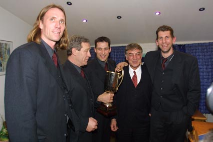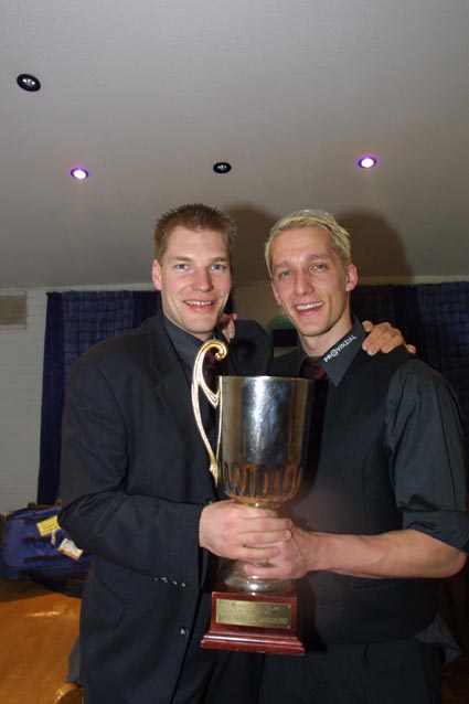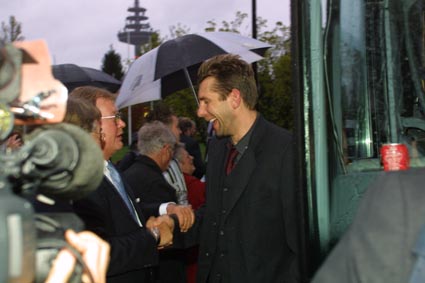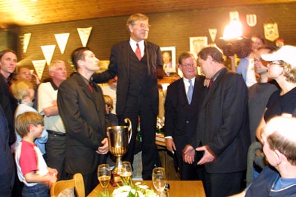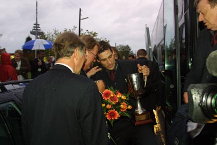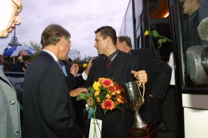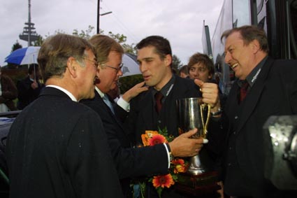 | EHF-Pokal-Finale 2002, Rückspiel: Empfang am Vereinsheim - Johan mit dem Pott. | EHF-Pokal-Finale 2002, Rückspiel: Empfang am Vereinsheim - Johan und Mattias mit dem Pott. | EHF-Pokal-Finale 2002, Rückspiel: Empfang am Vereinsheim. | ||||