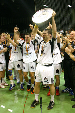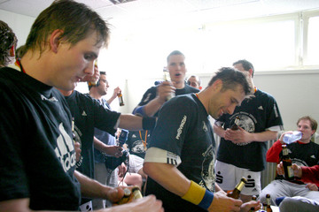 | Geschafft! THW-Kapitän Stefan Lövgren nach dem Sieg in der Kabine. | Geschafft! Durcheinander in der THW-Kabine nach dem Sieg. Martin Boquist, Kapitän Stefan Lövgren, Sebastian Preiß, Mattias Andersson. | Geschafft! THW-Kapitän Stefan Lövgren reckt die Meisterschale nach dem Spiel in Düsseldorf in die Höhe. Die Mannschaft jubelt. | Geschafft! THW-Kapitän Stefan Lövgren reckt die Meisterschale nach dem Spiel in Düsseldorf in die Höhe. Die Mannschaft jubelt. | |||