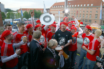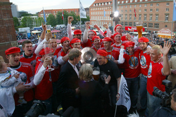 | Meisterfeier auf dem Kieler Rathausplatz: Klaus-Dieter Petersen bittet Kiels Oberbürgermeisterin Angelika Volquartz zum Tanz. | Meisterfeier auf dem Kieler Rathausplatz und wilde Gesangseinlagen. Von Links: Dennis Klockmann, Daniel Sommerfeld und Stefan Lövgren. | Meisterfeier auf dem Kieler Rathausplatz: Sebastian Preiß präsentiert den Fans die Meisterschale. | Meisterfeier auf dem Kieler Rathausplatz: Die Kieler Fans gartulieren dem Erzrivalen SG Flensburg-Handewitt zur 6. Vizemeisterschaft... | |||