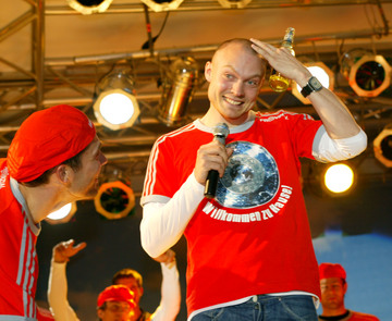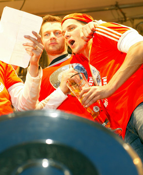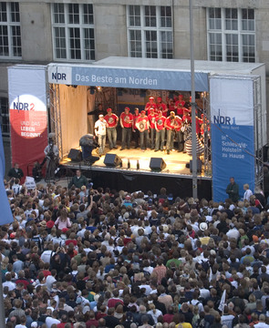 | Meisterfeier auf dem Kieler Rathausplatz: Youngster Christoph Schindler springt Christian Zeitz in die Arme. | Meisterfeier auf dem Kieler Rathausplatz: Über 20.000 Fans feiern ihren THW Kiel auf der NDR-Bühne. | Meisterfeier auf dem Kieler Rathausplatz und wilde Gesangseinlagen. Von Links: Frode Hagen und Adrian Wagner. | Meisterfeier auf dem Kieler Rathausplatz und wilde Gesangseinlagen: Hernik Lundström. | |||