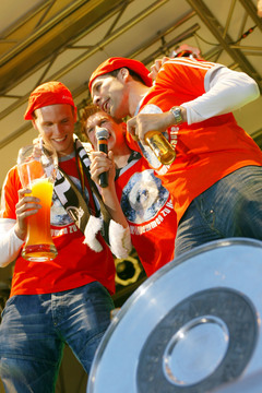 | Meisterfeier auf dem Kieler Rathausplatz: THW-Kapitän Stefan Lövgren begutachtet die neue Frisur seines schwedischen Landsmanns Henrik Lundström. | Meisterfeier auf dem Kieler Rathausplatz: Klaus-Dieter Petersen betrachtet die Meisterschale. | Meisterfeier auf dem Kieler Rathausplatz: Klaus-Dieter Petersen bittet Kiels Oberbürgermeisterin Angelika Volquartz zum Tanz. | Meisterfeier auf dem Kieler Rathausplatz: Klaus-Dieter Petersen bittet Kiels Oberbürgermeisterin Angelika Volquartz zum Tanz. | |||