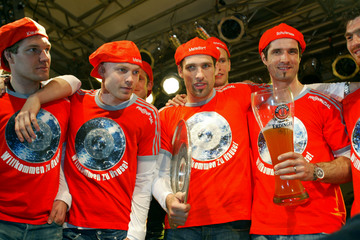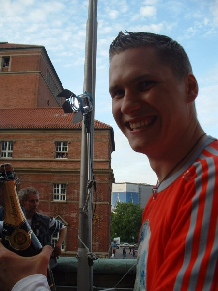 | Meisterfeier auf dem Kieler Rathausplatz und müde Helden. Von links Marcus Ahlm, Christoph Schindler und Stefan Lövgren. | Meisterfeier auf dem Kieler Rathausplatz: Marcus Ahlm mit der Meisterschale. | Meisterfeier auf dem Kieler Rathausplatz: Marcus Ahlm mit der Meisterschale. | Meisterfeier auf dem Kieler Rathausplatz: THW-Kapitän Stefan Lövgren lässt die Meisterschale nicht mehr los. | |||