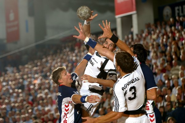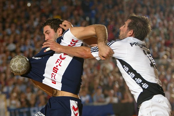| Lövgren und Ahlm können Jensen nicht stoppen. | Boldsen gegen Ahlm. | Lars Christiansen. | Stefan Lövgren gegen Blazenko Lackovic. | |||