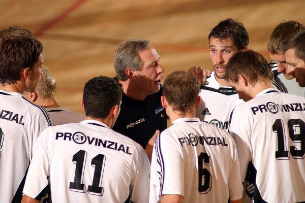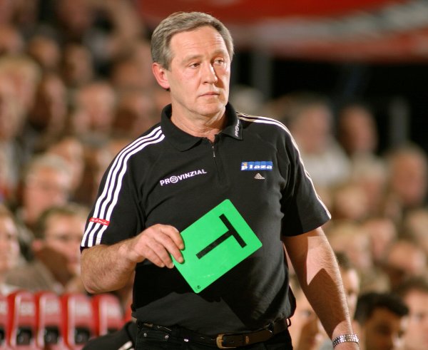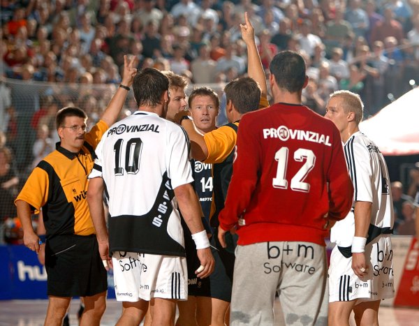 | Noka Serdarusic mit der "Timeout"-Karte. | Marcus Ahlm. | Henning Fritz. | Mannschaftsbesprechung während einer Auszeit. | |||