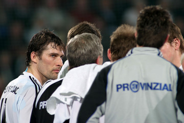 | Christian Zeitz wird von Joachim Boldsen attackiert. | Christian Zeitz setzt zum Torwurf an, im Hintergrund Joachim Boldsen. | Christian Zeitz im Gespräch mit Flensburgs Torwart Jan Holpert. | Flensburgs Trainer Kent-Harry Andersson und SG-Geschäftsführer Thorsten Storm sitzen nebeneinander auf der Bank. | |||