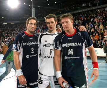 | Kapitän Stefan Lövgren während einer Auszeit. | Adrian Wagner greift sich nach einem Foul an den Hals. | Norwegische Freunde: Glenn Solberg, Frode Hagen und Johnny Jensen. | SG-Kapitän Sören Stryger am Ball. | |||
