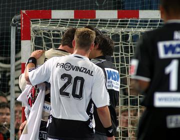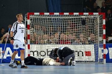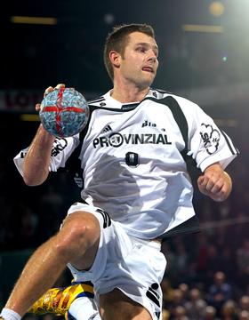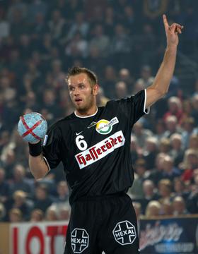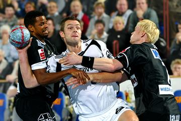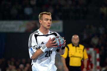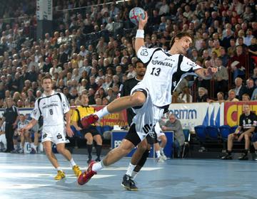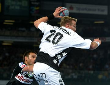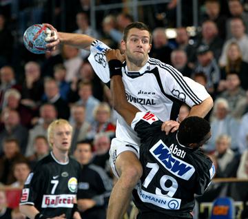 | Gregor Tkaczyk. | Marcus Ahlm setzt sich durch. | Frode Hagen lässt sich von Joel Abati nicht stoppen. | Sebastian Preiß gegen Karol Bielecki. | |||
