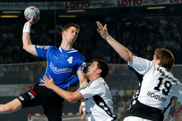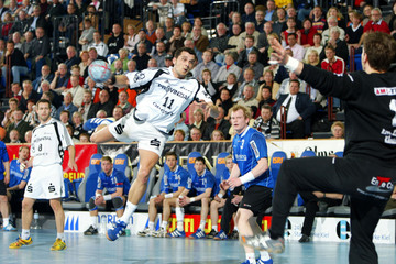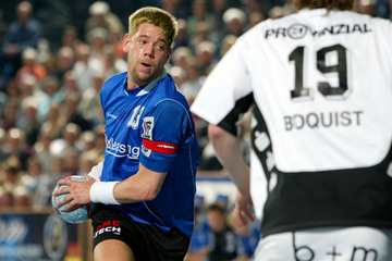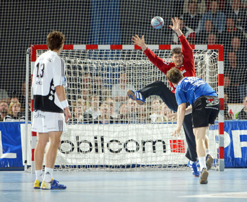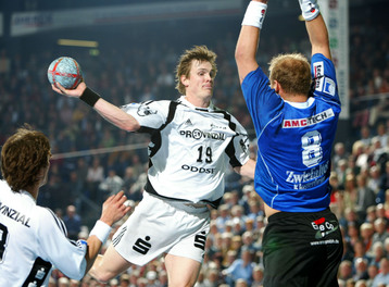 | Pfullingens Alexandar Stevic hat sich gegen Martin Boquist durchgesetzt und zieht ab. | Martin Boquist setzt sich gegen Axel Kromer in Szene. | Adrian Wagner fliegt zum Torwurf heran. | THW-Torwart Henning Fritz im Siebenmeter-Duell gegen Björn Navarin. Links Marcus Ahlm. | |||