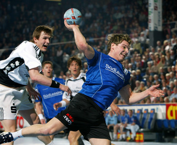 | Stefan Lövgren im Zweikampf mit Pfullingens Marco Bräuning. | ||||||