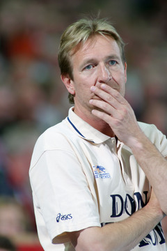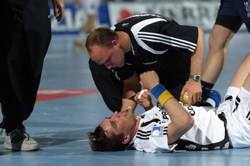 | THW-Kapitän Stefan Lövgren liegt verletzt am Boden, Physiotherapeut Björn Rother kniet bei ihm. | ||||||