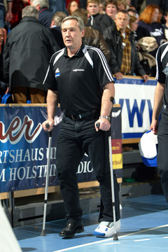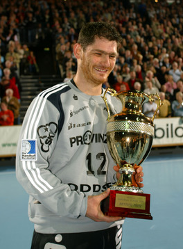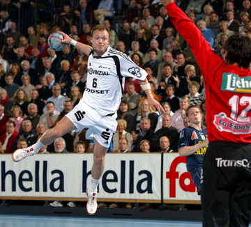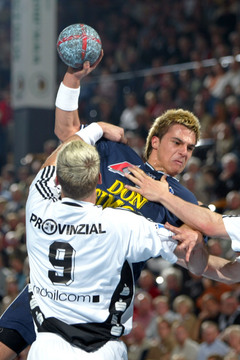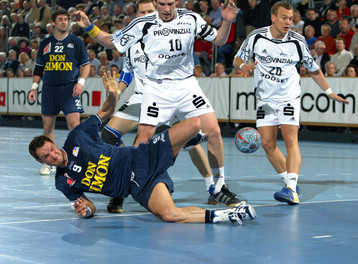 | Wallaus Markus Roßmeier überspringt Abwehrspieler Klaus-Dieter Petersen. | THW-Trainer Noka Serdarusic läuft nach seinem Archillessehnen-Abriss an Gehhilfen durch die Ostseehalle. | THW-Linksaußen Henrik Lundström im Sprungwurf, rechts Wallaus Torhüter Zoran Djordjic. | THW-Torhüter Henning Fritz präsentiert die Trophäe zur Wahl zum "Welthandballer des Jahres 2004". | |||