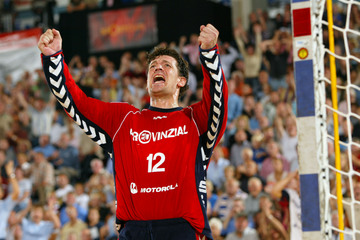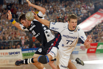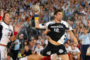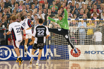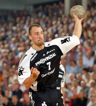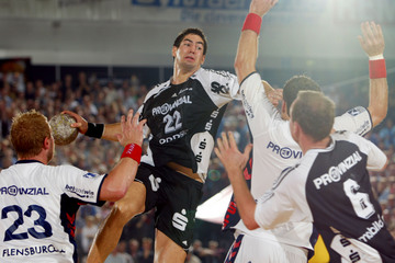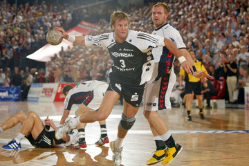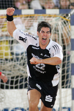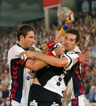 | Flensburgs Kreisläufer Michael Knudsen setzt zum Torwurf an, Stefan Lövgren (links) hat ihn verpasst. | Nikola Karabatic ballt die Faust und schreit seine Freude über einen seiner Treffer hinaus. | Nikola Karabatic ballt die Faust und schreit seine Freude über einen seiner Treffer hinaus. rechts Vid Kavticnik. | Stefan Lövgren setzt zum Torwurf an und wird dabei von den Flensburger Abwehrspielern Glenn Solberg (links) und Johnny Jensen (verdeckt) attackiert. | |||
