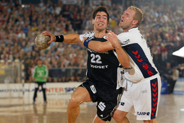 | Nikola Karabatic wird von Flensburgs Abwehrspieler Michael V. Knudsen attackiert und zu Fall gebracht. | Nikola Karabatic setzt zum Torwurf an und wird dabei von Flensburgs Joachim Boldsen gehalten. | Flensburgs Torhüter Jan Holpert ballt die Fäuste und schreit seine Freude heraus. | Christian Zeitz. | |||