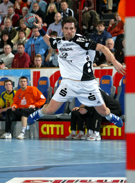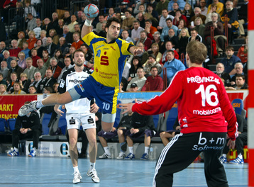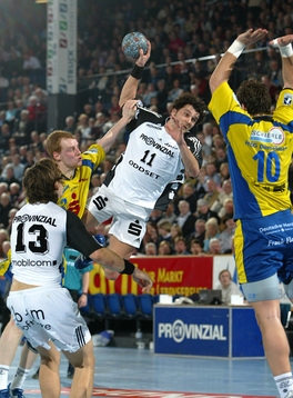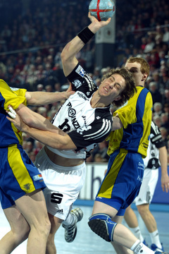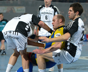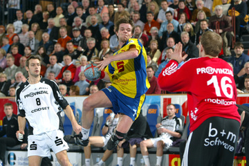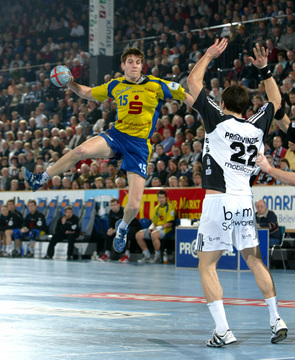 | Marcus Ahlm setzt sich durch. | Adrian Wagner, links Marcus Ahlm. | Vid Kavticnik. | Stefan Lövgren. | |||