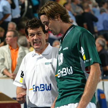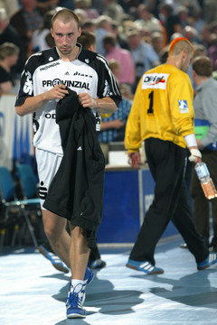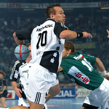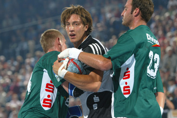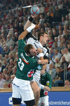 | Marcus Ahlm versucht, sich gegen Lars-Henrik Walther und Andrius Stelmokas (links) durchzusetzen. | Rechtsaußen Vid Kavticnik geht vom Spielfeld. Im Hintergrund läuft Martin Galia von Frisch Auf Göppingen. | Nikola Karabatic. | Göppingens Trainer Velimir Petkovic im Gespräch mit seinem Spieler Volker Michel. | |||
