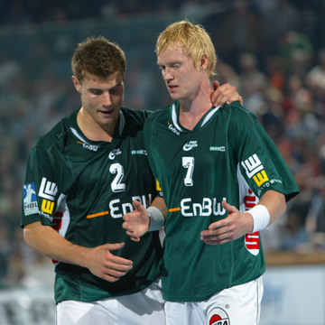 | Stefan Lövgren und Adrian Wagner verlassen nach dem THW Sieg das Spielfeld. | Die Schiedsrichterinnen Jutta Ehrmann und Susanne Künzig. | Mannschaftsarzt Dr. Detlev Brandecker bei der Arbeit. Im Hintergrund ist Nikola Karabatic zu sehen. | ||||