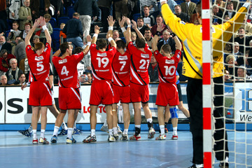 | THW-Torhüter Henning Fritz fachsimpelt während der Halbzeitpause mit seinem Kollegen Peter Gentzel von der HSG Nordhorn. | Nordhorns Holger Glandorf wird beim Wurf von THW-Mittelmann Viktor Syilagyi attackiert. | Iwan Usric beim Wurf aufs Tor. | Iwan Usric beim Wurf aufs Tor. | |||