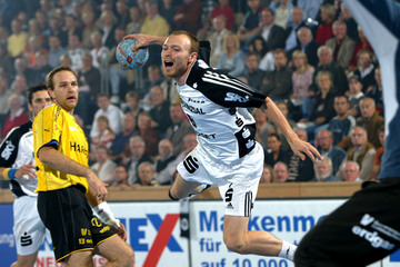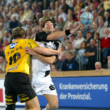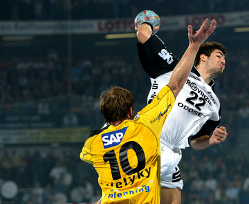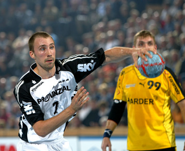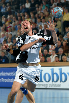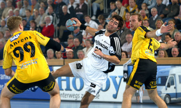 | Marcus Ahlm wird von Ahrens attackiert. | Vid Kavticnik beim Siebenmeter. | Lövgren gegen Klimovets. | Nikola Karabatic zieht ab. | |||