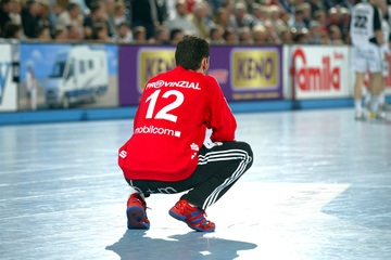 | Kiels dritter Torwart Dennis Klockmann dehnt sich während der Halbzeitpause. | Tipps vom Welthandballer des Jahres 2004: Henning Fritz nutzt die Halbzeitpause, um sich mit seinem Ersatz-Torwart Dennis Klockmann zu unterhalten. | Dennis Klockmann schreibt Autogramme. | Dennis Klockmann. | |||