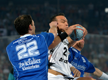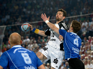 | Henning Fritz. | Christian Zeitz wird von den Pfullingern Andreas Blank (links) und Alexander Trost (rechts) attackiert. | Nikola Karabatic beim Strafwurf. | Augen zu und durch: Spielmacher Stefan Lövgren wird von Pfullingens Markus Gaugisch (rechts) im Sprung attackiert. Im Vordergrund Axel Kromer (links). | |||