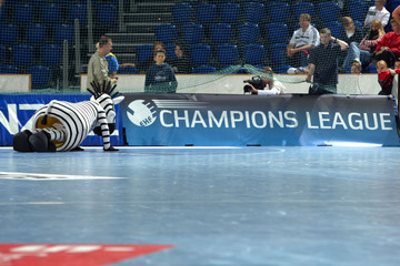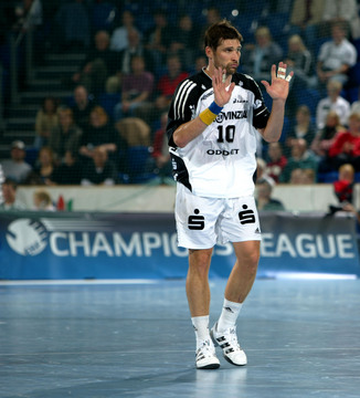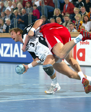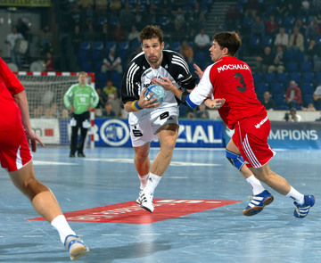 | Stefan Lövgren attackiert Dmitri Botscharnikow. | Vid Kavticnik. | Henning Fritz. | Auszeit. | |||