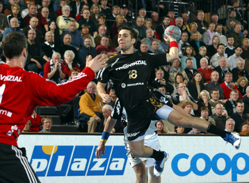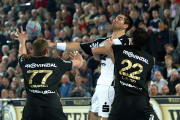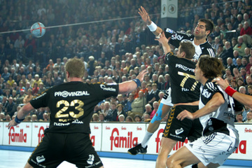 | Jeppsen und Ahlm gegen Knudsen. | Karatbatic passt. | Lars Christiansen beim Strafwurf. | Torge Johanssen gegen Thierry Omeyer. | |||