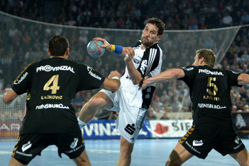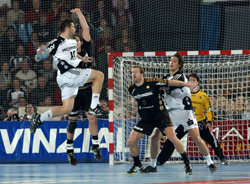 | Stefan Lövgren steigt hoch. | Dr. Mommsen, Boldsen, Beutler und Andersson. | Karabatic gegen Lauritzen. | Knudsen und Lijewski gegen Karabatic. | |||