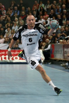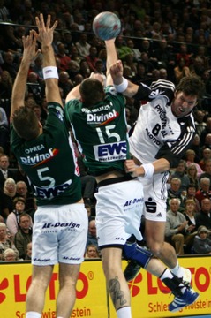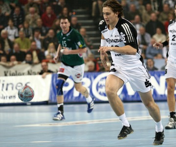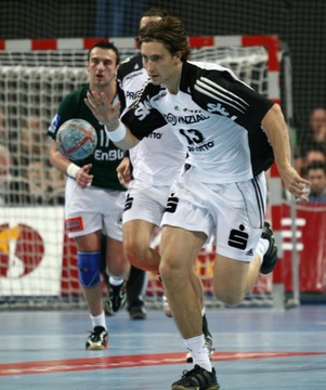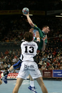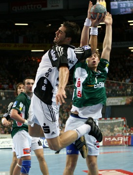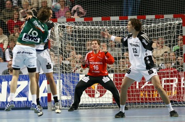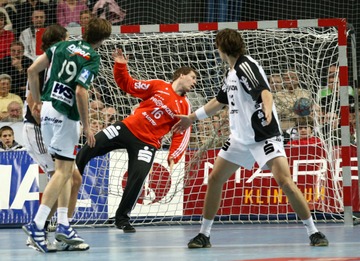 | Marcus Ahlm am Kreis. | Nikola Karabatic setzt sich durch. | Stefan Lövgren gegen Silviu Baiceanu. | Dominik Klein. | |||