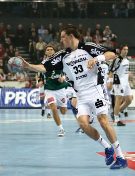 | Tobias Karlsson. | Tobias Karlsson. | Die leere THW-Bank. | Jeppesen verteidigt gegen Michel. | |||