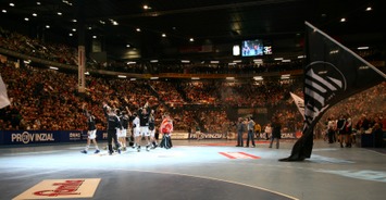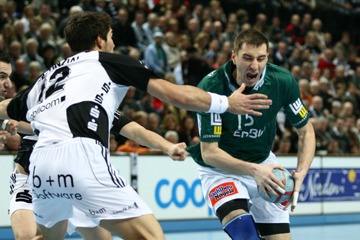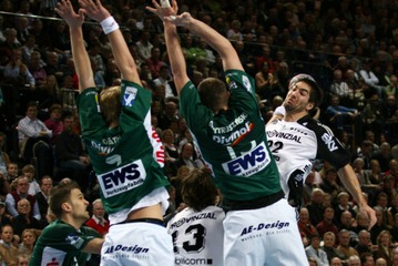 | Nikola Karabatic. | Marcus Ahlm verteidigt. | Pelle Linders ist durch. | Jubel beim SCM. | |||