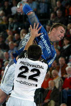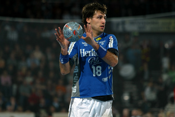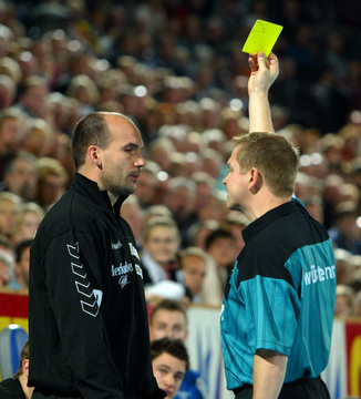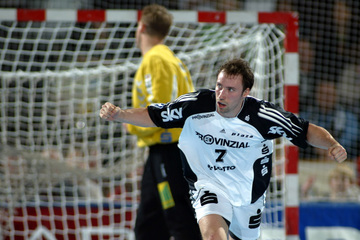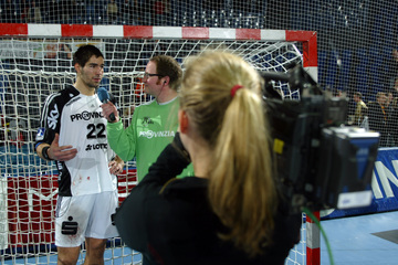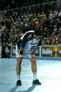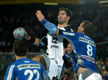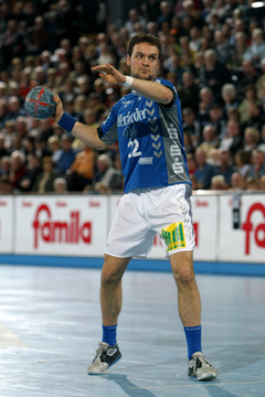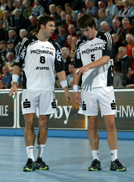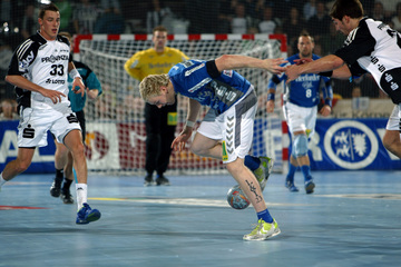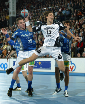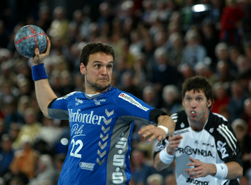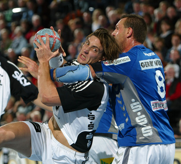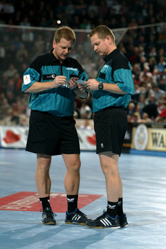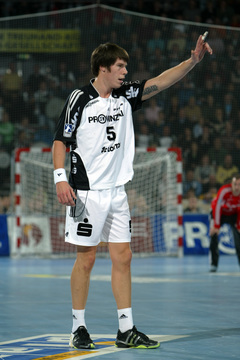 | Pelle Linders attackiert Tomas Mocsai. | Nikola Karabatic attackiert Filip Jicha. | Logi Geirsson. | Die Schiedsrichter Methe/Methe. | |||