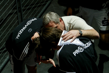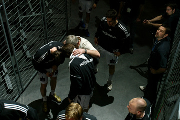 | Marcin Lijewski im Angriff. | Der THW schwört sich vor dem Einlaufen in den Katakomben der Campushalle ein. | Letzte Anweisungen von "Noka" an "Mini". | Letzte Anweisungen von "Noka" an "Mini". | |||