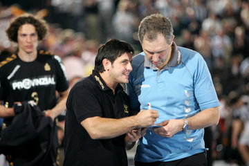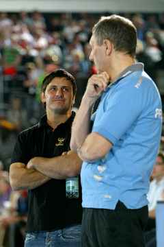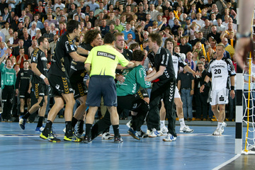 | Letzte Anweisungen von "Noka". | Uwe Schwenker blickt Richtung Champions-League-Pokal. | Die Bank der SG. | Der rot gesperrte Ljubomir Vranjes und sein Coach Kent-Harry Andersson. | |||