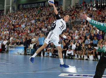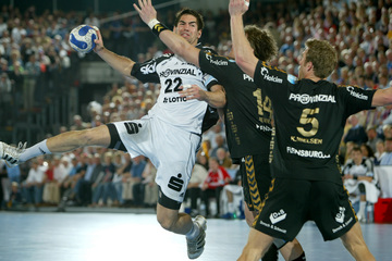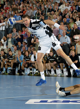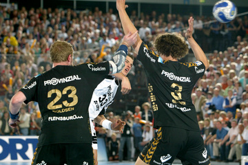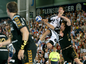 | Von Behren attackiert Nikola Karabatic. | Christian Zeitz gegen Lars Christiansen. | Dominik Klein. | Karabatic gegen von Behren und Nielsen. | |||