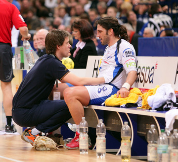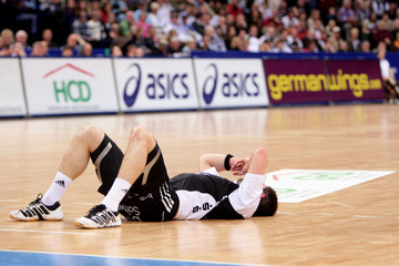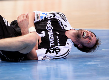 | Nikola Karabatic am Boden. | Bertrand Gille wird behandelt. | Nikola Karabatic. | Filip Jicha. | |||