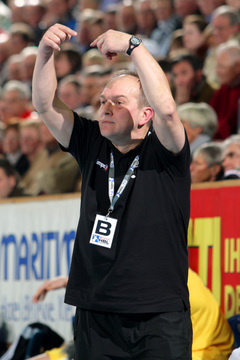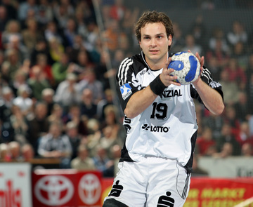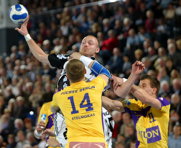 | Deckung! | Marcus Ahlm im Kampf um den Ball. | Viktor Szilagyi. | Füche-Coach Jörn-Uwe Lommel. | |||