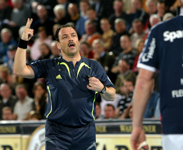 | Marcin Lijewski verlässtg nach seine dritten Zeitstrafe das Feld. | Marcus Ahlm. | Vid Kavticnik. | Kieler Jubel nach dem Sieg. | |||