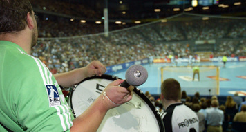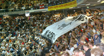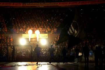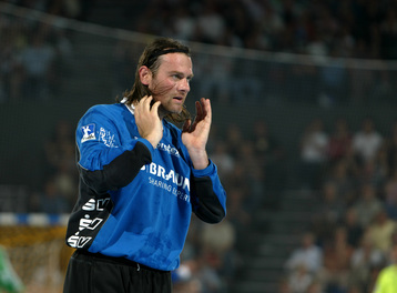 | Börge Lund. | Börge Lund vor dem Spiel. | In der Mitte: Lund, Kavticnik und Andersson. | Melsunger Fans. | |||
